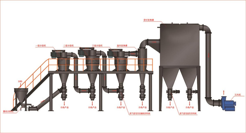 (6) 三層振動篩將銅鋁金屬顆粒分為18目、24目、30目等級的混合料, 分別進入比重分選機, 在機械振動和上升氣流的作用下, 比重大的銅顆粒向下運動, 比重小的鋁顆粒向上運動, 完成銅鋁金屬顆粒的分選;